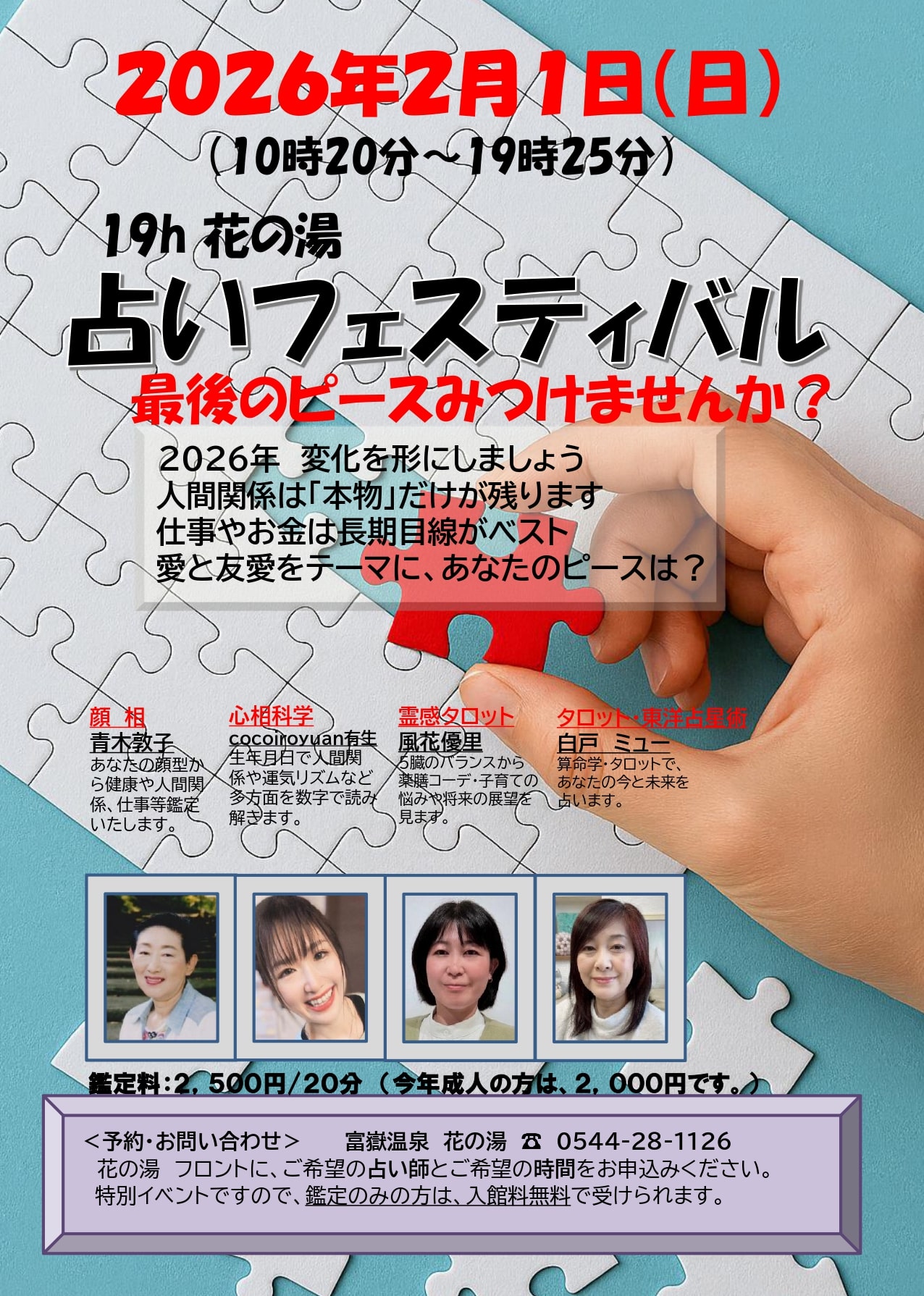 毎年2月第一日曜日に開催しています「花の湯占いフェスティバル」開催のご案内です。