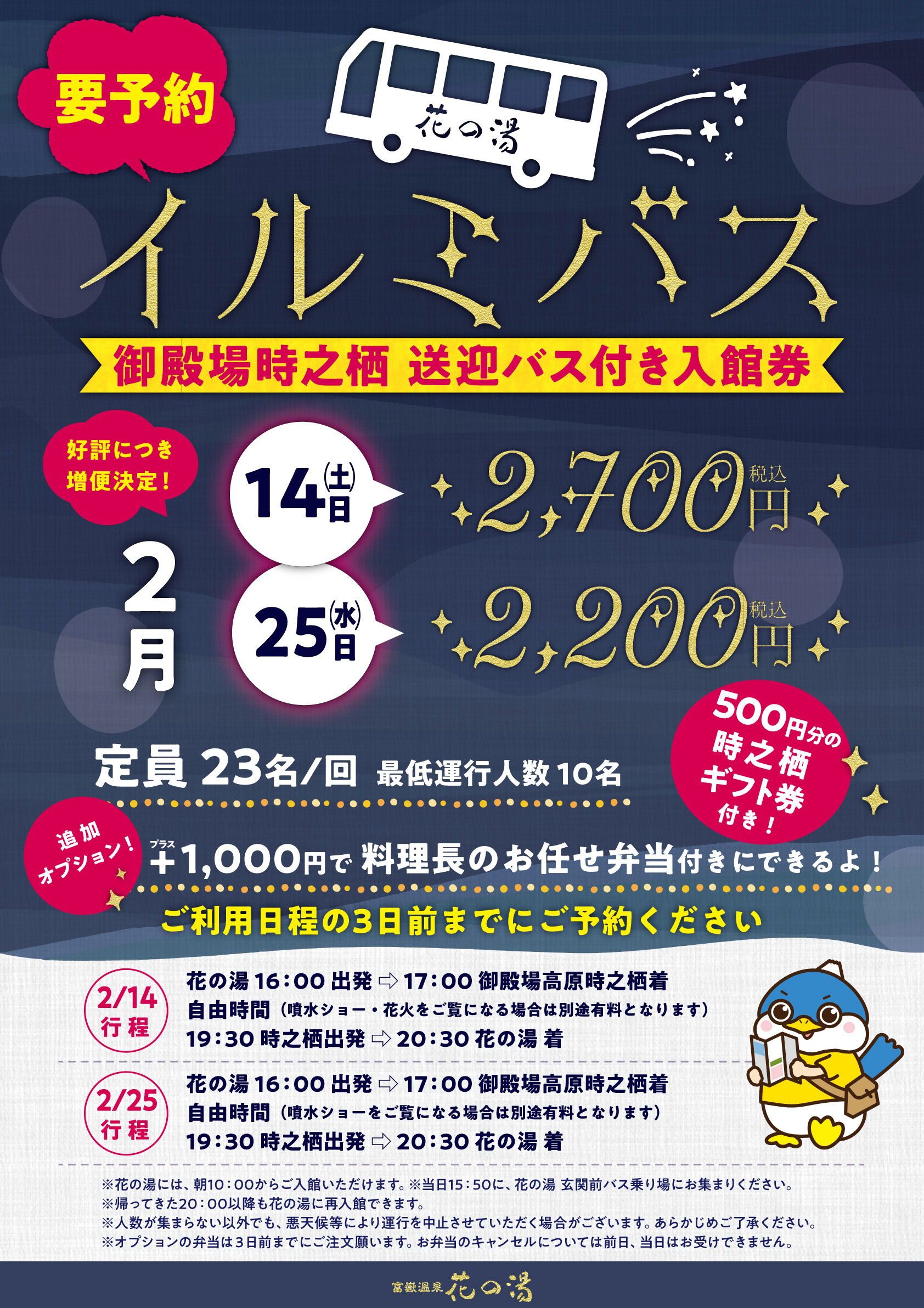 ※料金には運行日当日の花の湯ご入館料も兼ねております。