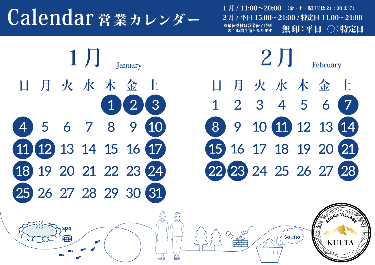 【アウトドアサウナ KULTA】2026年1月~2月 営業カレンダー