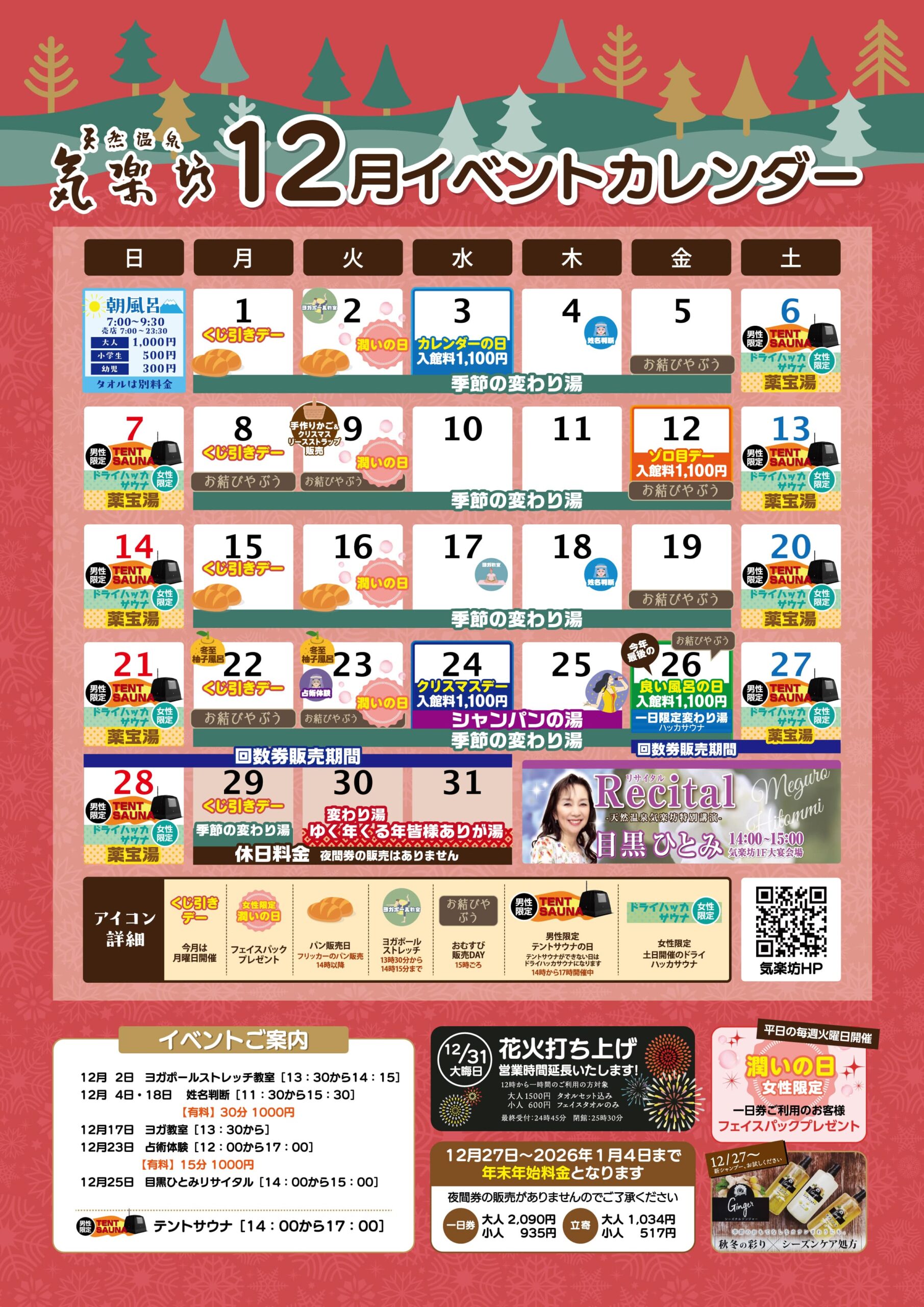 【天然温泉 気楽坊】イベントカレンダー 12月