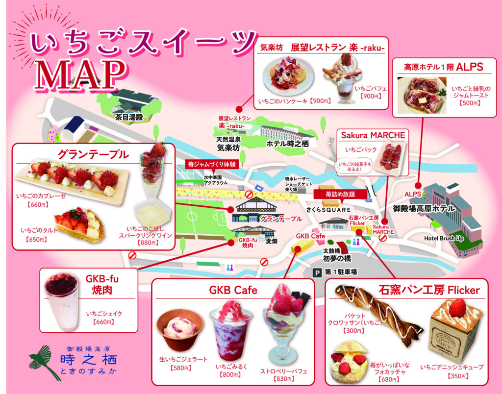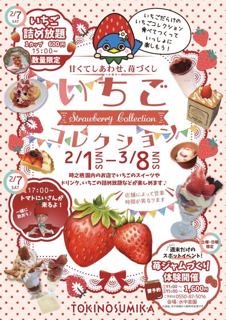 時之栖園内の各飲食店にて、期間限定の特別いちごメニューを販売します。